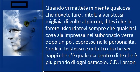 Quello che di importante devi fare è imprimere nel tuo Subconscio, attraverso il Conscio, delle belle immagini. Non puoi pretendere di credere ciecamente e all’improvviso al Superconscio, quindi la cosa più saggia è imparare e allenarsi a rendere pieno di “cose belle” il motore che abbiamo. Più immettiamo in lui positività e più essa si rifletterà e si concretizzerà nella nostra vita.